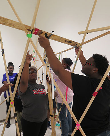 Image: Members of Arts + Public Life’s Teen Arts Council constructing a Floating Museum sticks and tape installation as part of the Smart Museum’s summer project In Anticipation of Belonging.