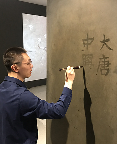 Conghao writes, “For young calligraphy learners, this stele is often the beginning point of their life-long practice of copying classic works. I began studying calligraphy when I was about five years old and started studying this stele when I was about seven. In the past seventeen years, I have copied it countless times, and it is still my favorite stele. I choose to perform this stele on Song Dong’s Traceless Stele not only because of its rich history and connection to Song Dong’s work, but also because of my personal attachment to this particular monument.”