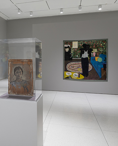 Image: Installation view of Take Care at the Smart Museum of Art, showing work by June Leaf and Kerry James Marshall.